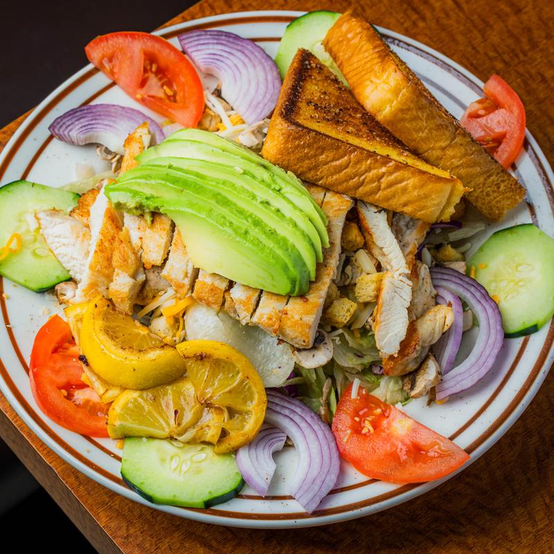 Grilled chicken breast, sliced tomato, red onion, avocado, mushrooms & grilled lemon on mixed salad with honey balsamic vinaigrette.