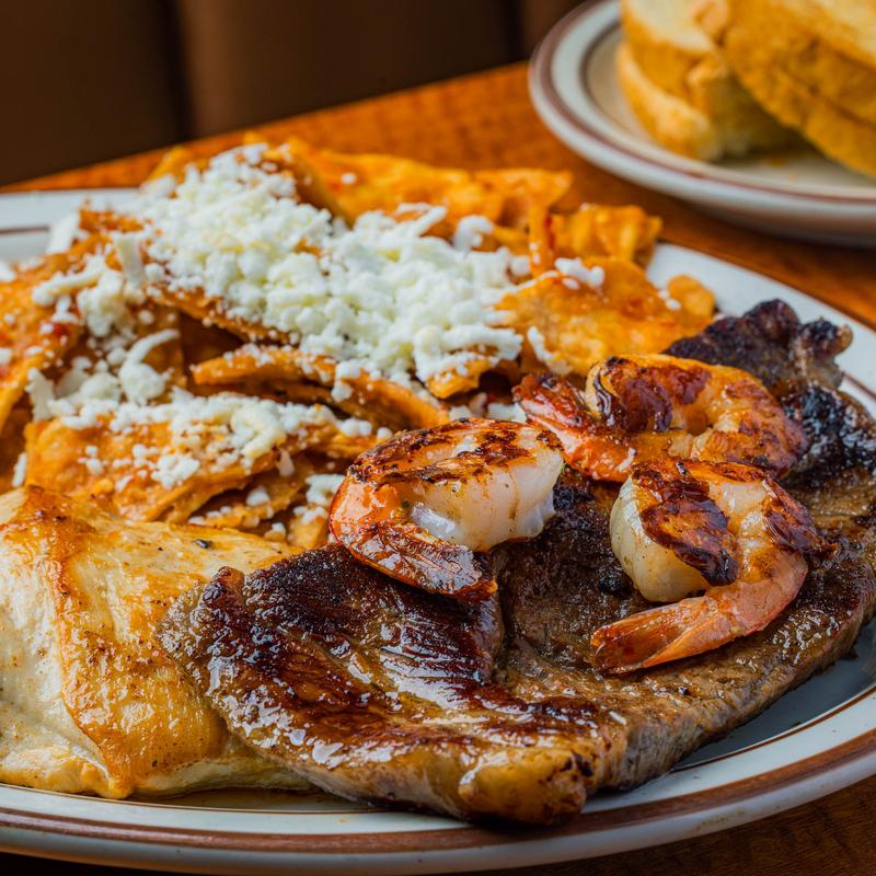 Our special french toast served with 2 eggs & two bacon strips or two sausage links.