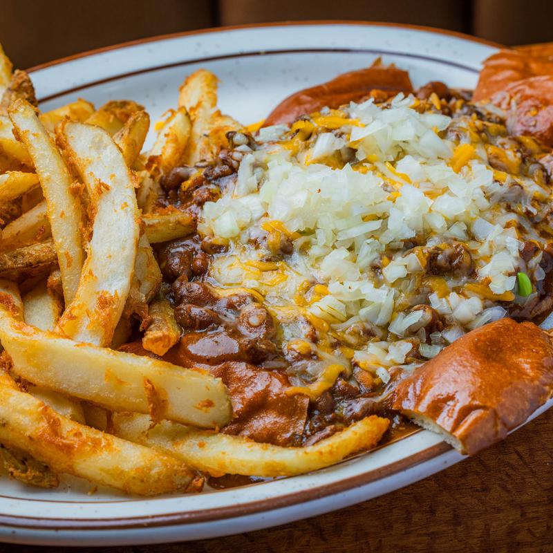 Topped with chili beans, diced onion & cheese.