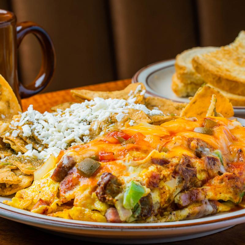 All omelettes are made with three eggs, served with hash browns or country potatoes, toast, and jelly or biscuit and gravy, or two pancakes.